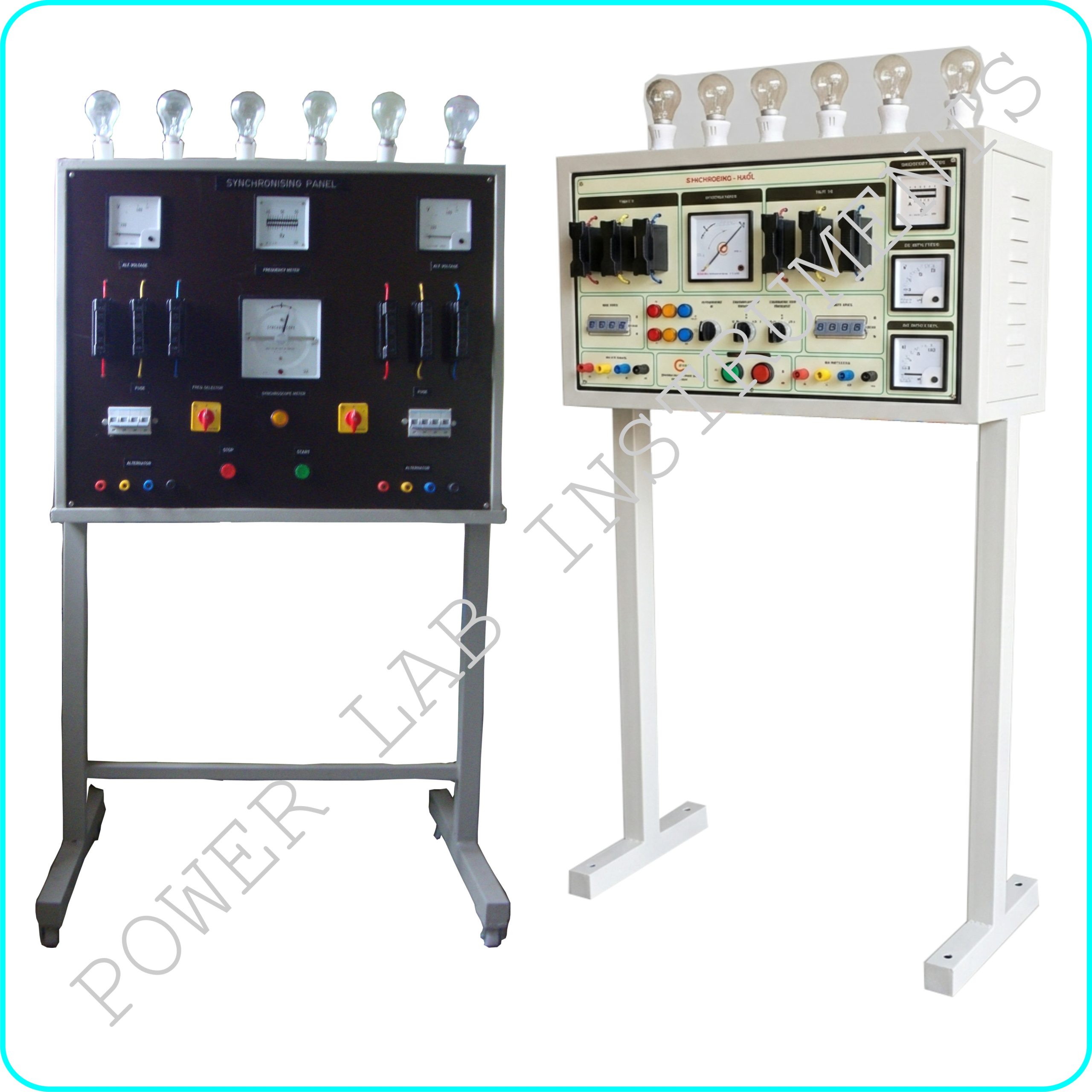 This synchronizing panel unit is designed to synchronize AC alternator with TNEB or Two alternators in Machines lab experiments by using the below three methods